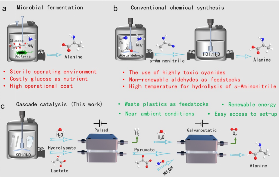 本研究构建了一个级联催化系统,结合了碱诱导的PLA解聚、脉冲电化学氧化和电化学还原胺化,在接近自然环境条件下产生丙氨酸,总产率高达69%。该研究在水溶液中引入碱催化剂将PLA降解为乳酸,随后将得到的PLA水解液通过脉冲电位在Pd负载的氢氧化镍电催化剂(Pd/Ni(OH)2)上合成丙酮酸,最后利用TiO2催化剂将丙酮酸转化为丙氨酸。这种合成丙氨酸的级联催化受益于三个连续过程中的高效率、温和的操作条件以及使用廉价塑料废物为原料,因此不需要承受传统生物和化学方法所需的严酷条件和昂贵的原料消耗。