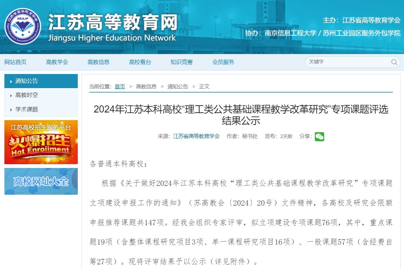 根据《关于做好2024年江苏本科高校“理工类公共基础课程教学改革研究”专项课题立项建设申报工作的通知》(苏高教会〔2024〕20号)文件精神,各高校及研究会限额申报推荐课题。经江苏省高等教育学会组织专家评审,拟立项建设专项课题76项,其中,重点课题19项(含整体课程研究项目3项、单一课程研究项目16项)、一般课题57项(含经费自筹27项)。xp天堂