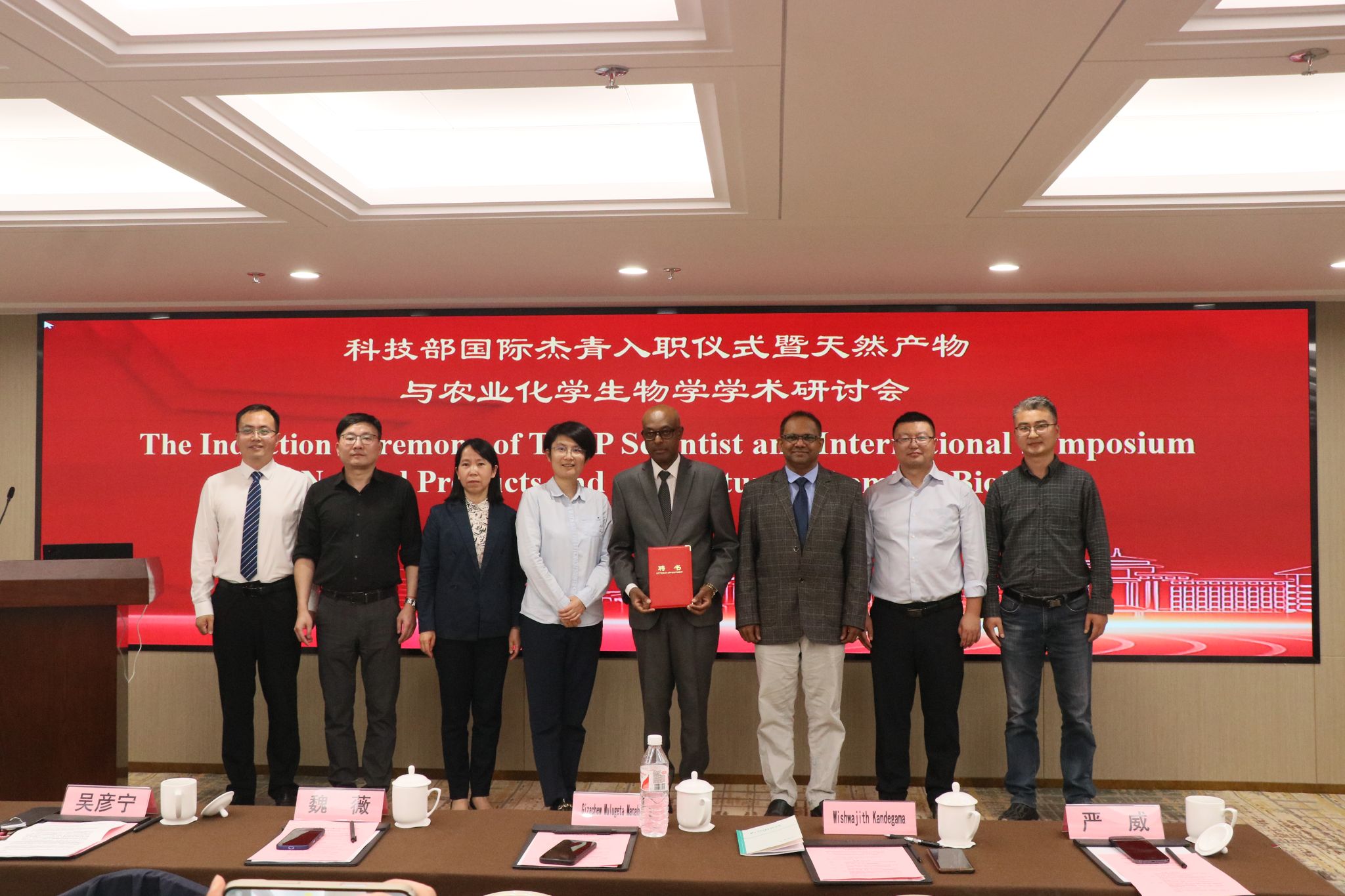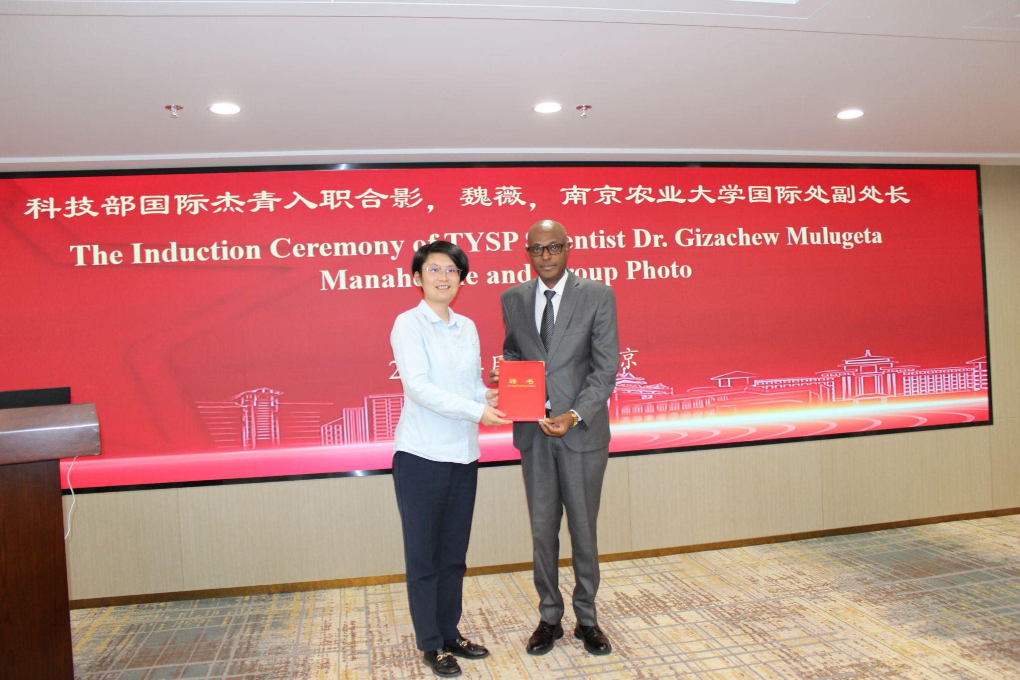 国际处副处长魏薇为Gizachew博士颁发“国际杰青计划青年科学家”聘书。