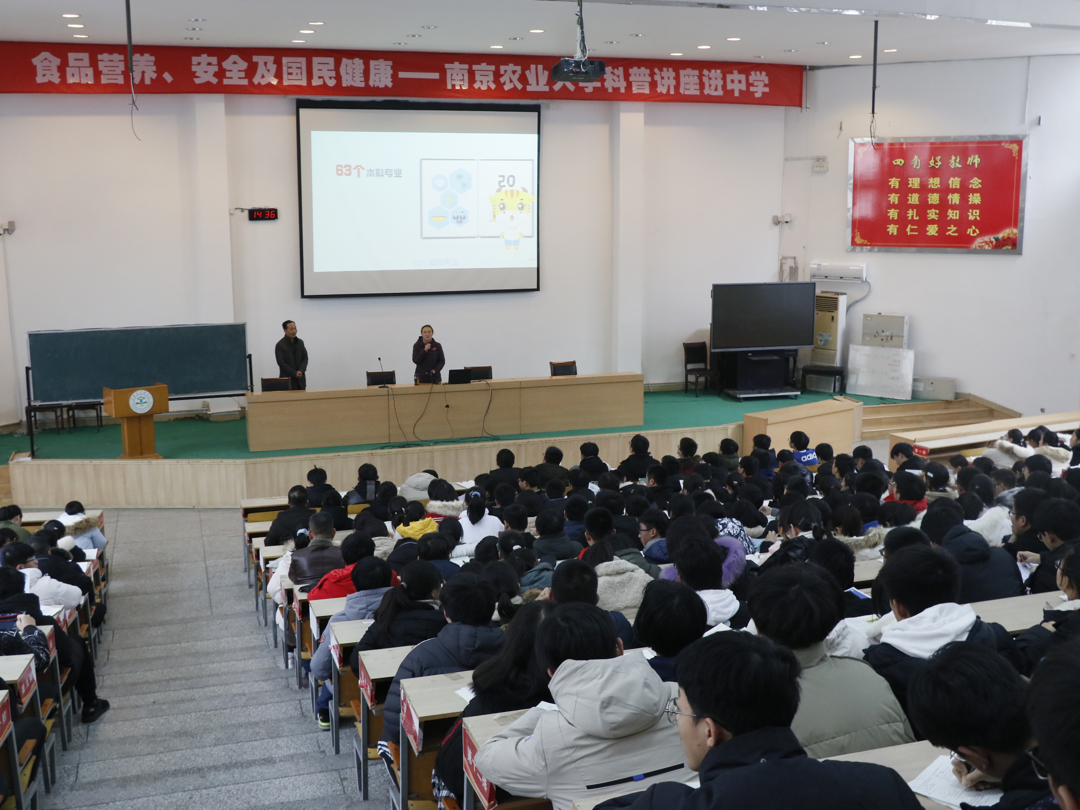 的基本情况,并鼓励同学努力学习,欢迎同学们选择南农。随后食品科技学院韩永斌教授为该校全学生带来主题为“食品营养、安全和国民健康”的精彩科普讲座。韩教授的讲座深入浅出,生动有趣,让同学们在趣味知识中了解食品科学,播种兴趣的种子。