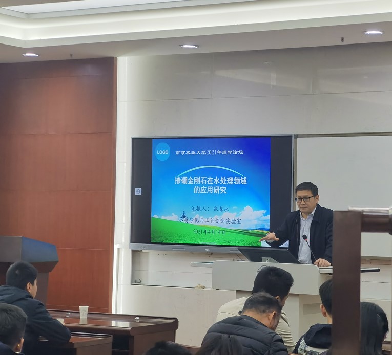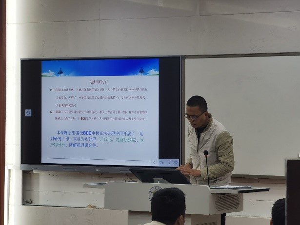 第一位报告人张春永副教授作了题为“掺硼金刚石在水处理领域的应用研究”的汇报,他以水质指标这一重要的参数进行开场,引出了他所做的电化学(BDD)工艺金刚石电极材料进行水处理的研究,详细提及了有关电解质、计算学方法优化实验条件、生物法和化学法合成材料等相关专业问题,系统性地汇报了他目前所做出的工作。随后他提及了协作效应,即课题组之间、导师和研究生之间、研究生和本科生之间的良性协作完成科研目标这一效应,希望学院的教师和学生之间应协调好这一效应,促进科研的发展。