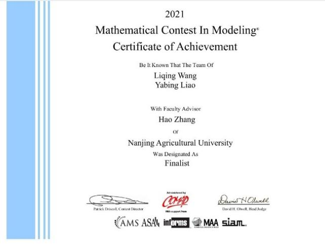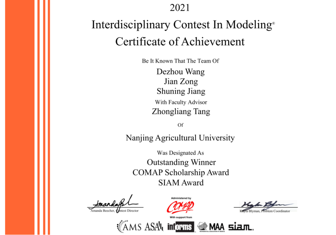 参赛历史的最佳成绩。我校获得Outstanding Winner的参赛队伍同时还获得了COMAP Scholarship(10000美元,每年仅有四支队伍获此殊荣)和SIAM Award(每年仅有六支队伍获此殊荣)。