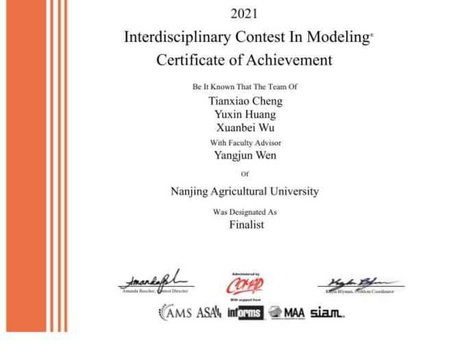 实现了此项国际性赛事的历史性突破。其中,王德州(自动183)、宗健(农经182)、蒋舒宁(交运181)参赛队斩获Outstanding winner奖,程天晓(统计181)、黄雨馨(信息181)、吴宣蓓(统计181)参赛队和王莉晴(工管182)、廖亚兵(机制172)参赛队双双获Finalist奖。COMP官网数据显示,本届竞赛共有来自全球各高校的26148支队伍参赛,Outstanding winner奖的获奖比例约为0.1%,Finalist奖的获奖比例约为1%。