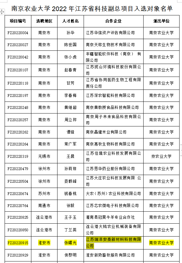 近日,省委人才办、省科技厅印发了《关于确定2022年江苏省科技副总项目入选对象的通知》,我院张曙光老师与合作企业江苏瑞洋安泰新材料科技有限公司联合申报的科技副总项目入选。