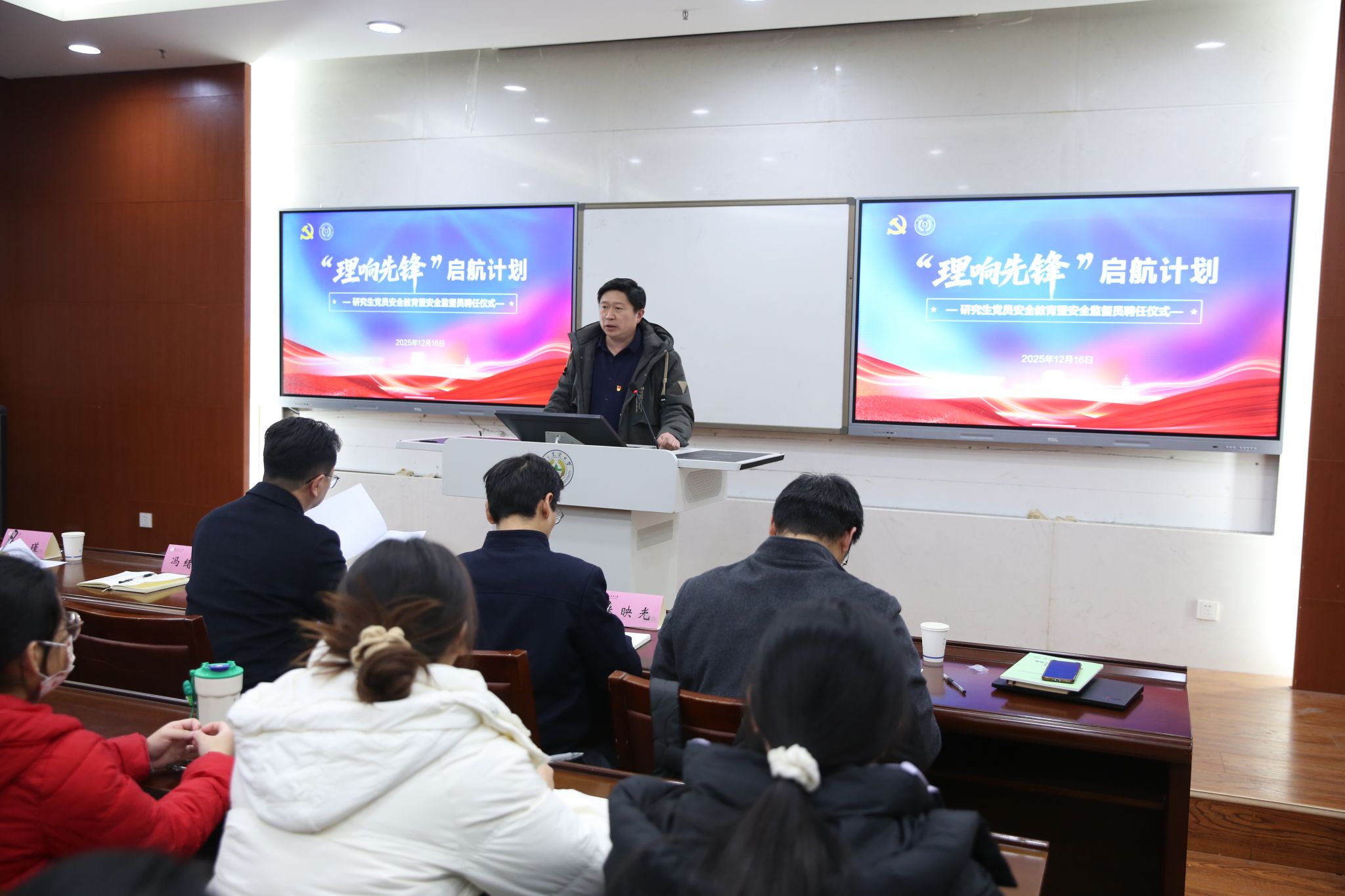 “理响先锋” 启航计划正式启动,研究生党员安全教育暨安全监督员聘任仪式同步顺利举行。院党委书记李日葵,党委副书记冯绪猛,副院长朱映光、张瑾、吴顺凡出席活动,研究生党支部书记、院兼职研究生辅导员及全体研究生党员共同参与。本次聘任仪式由冯绪猛主持。
