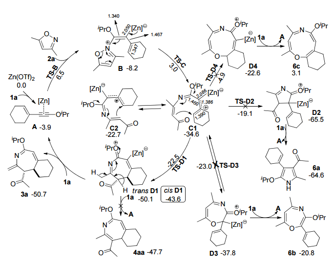 该工作报道了廉价金属Zn2+催化烯炔醚与异噁唑啉高效的进行4+3开环环化反应选择性的得到多官能化的2H-Azepines产物,同时还可以用手性的双噁唑啉配体实现该反应的不对称合成。邓超课题组通过理论计算详细研究了该反应的反应机理及复杂的环化选择性。
