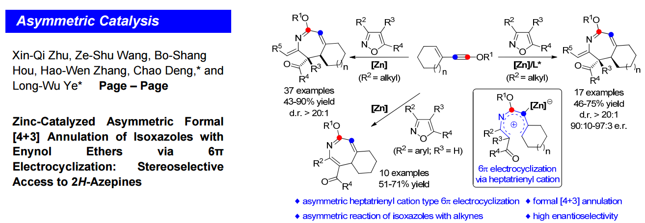 近日,我院邓超副教授与厦门大学叶龙武教授合作在国际权威刊物Angewandte Chemie International Edition(德国应用化学,SCI-IF2018: 12.257)在线发表了题为“Zinc-Catalyzed Asymmetric Formal [4+3] Annulation of Isoxazoles with Enynol Ethers via 6π Electrocyclization: Stereoselective Access to 2H-Azepines” 的研究论文。邓超副教授为论文的第一通讯作者。