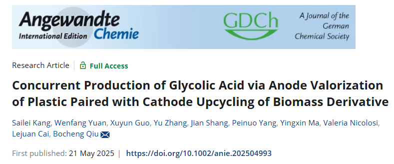 邱博诚教授研究团队创新性地设计了一种配对电解系统,通过协同耦合阳极乙二醇氧化与阴极草酸还原反应,实现了在阴阳两极同时合成高价值化学品乙醇酸,为资源循环利用提供了新的解决方案。该研究工作以“Concurrent Production of Glycolic Acid via Anode Valorization of Plastic Paired with Cathode Upcycling of Biomass Derivative”为题,发表在化学类顶级期刊《Angewandte Chemie International Edition》。