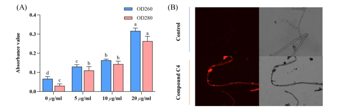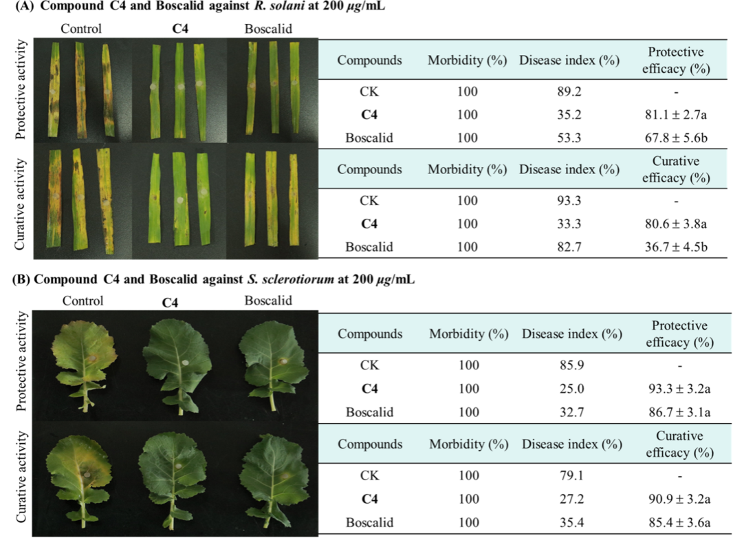 本研究将活性片段酰肼与天然产物L-紫苏醛拼接设计合成了36个L-紫苏醛衍生物。初步立体活性结果表明,大多数目标化合物对植物病原真菌具有较好的活性。值得注意的是,化合物C4对水稻纹枯病菌,小麦赤霉病菌,菌核病菌和苹果腐烂病菌的EC50值分别为0.260 μg/mL,0.480 μg/mL,0.240 μg/mL,0.512 μg/mL均优于商品药多菌灵(0.651 μg/mL,0.804 μg/mL,0.520 μg/mL,0.898 μg/mL)。活体实验表明,化合物C4在200 μg/mL浓度下开展的保护和治疗实验中对水稻纹枯病的保护和治疗效果达到81.1%和80.6%;对油菜菌核病的保护和治疗效果达到93.3%和90.9%。