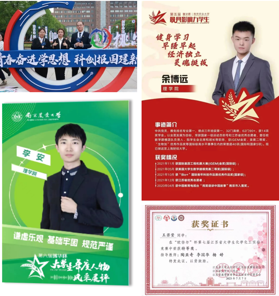 本科生余博远获评校第五届“瑞华杯”最具影响力学生、本科生李安获评校第六届“瑞华杯”最具影响力学生提名。“欧倍尔”杯第七届江苏省大学生化学化工实验竞赛中荣获特等奖、二等奖、三等奖,江苏省第十八届“挑战杯”大学生课外学术科技作品竞赛中获“恒星级”奖项,我院学生参与2023年国际基因工程机械设计大赛(IGEM)数模组获全球金奖。高等数学竞赛、美国大学生数学建模竞赛、化学化工实验竞赛等比赛中屡创佳绩,获20余项奖项。理院学子见贤思齐,树立远大目标,导引生涯发展提高标准,争取圆梦更高平台。