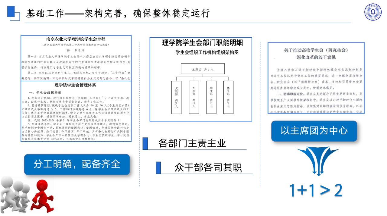 有着完备的学生会章程,同时自上而下拥有详细合理的考核奖惩制度,以此为依据进行严格监督并进行公示。筹划人员梯队建设,定期开展部门会议,组织以思想引领、工作技能为主要方面的相关培训,提高学生组织的运作效率和质量。老师贴心经验分享,前辈开课技能指导,成员之间互相帮助,多维驱动机制保障活动 。