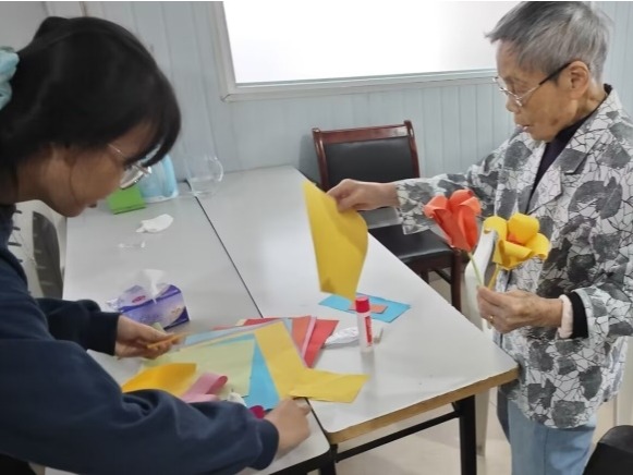 活动最后的手工剪纸环节既具传统意义又充满创意。志愿者们耐心地协助老人们剪纸;老人们发挥想象力,剪出了各式各样精美的作品。看着自己的作品,老人们充满了成就感,志愿者们也为老人们感到开心。