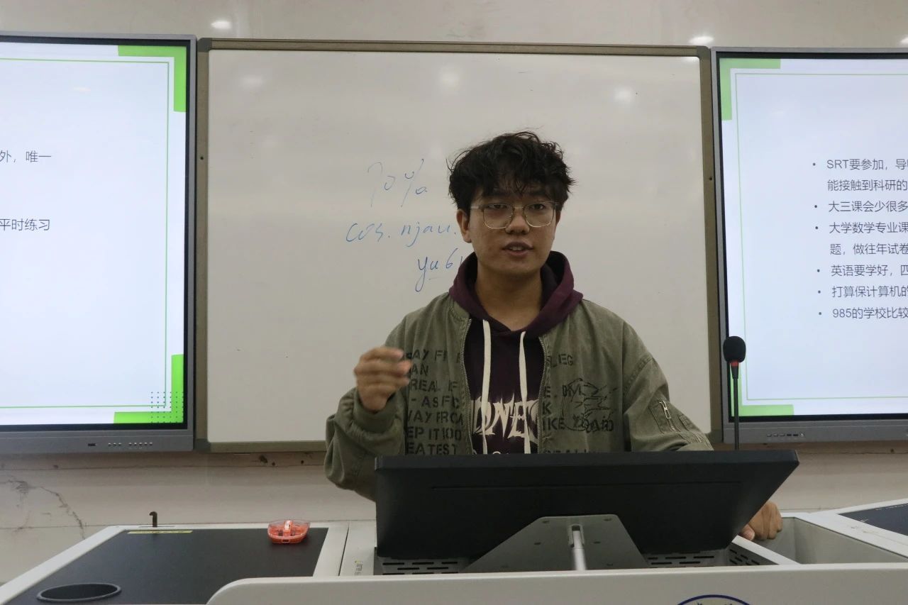 朱茂隆学长向大家简单介绍了自己的个人情况以及保研流程。他强调保研是一场旷日持久的战争,而绩点是保研的根本保证,学长还建议选择竞赛时应与自己未来发展方向相契合,养成科研素养,不要被局限、大胆探索,明晰保研意向。