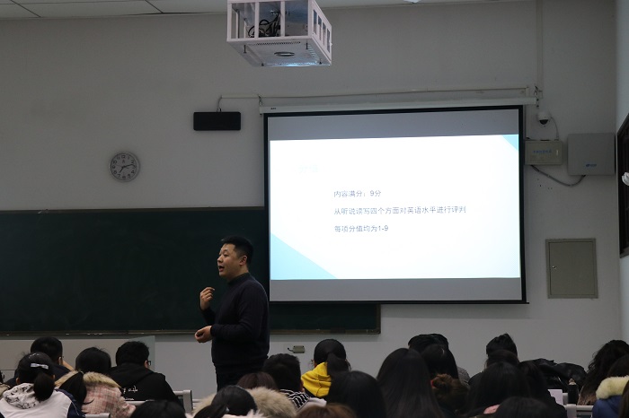 紧接着,他就雅思考试的四部分展开,分别是听力、阅读、口语和写作。在介绍了雅思听力时,他着重介绍了交谈时的话题范围以及在这一环节该如何听内容的侧重点。在介绍阅读部分时,他主要分享了一些阅读和做题小技巧。随后在介绍写作部分时,他对写作过程中应注意什么问题给出了自己的见解。在介绍口语部分时,他就口语部分所包含的三个方面——个人简介以及回答、个人陈述、双向讨论展开讲解。