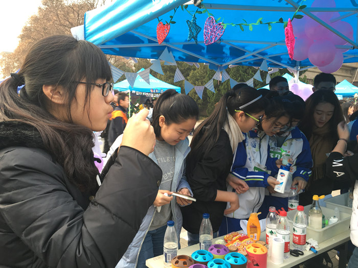 的摊位经过了同学们的精心布置,在众多摊位中也丝毫不见逊色。我们凭借独特奇妙的化学原理组织了有趣的比赛活动,将乐趣与知识结合,获得一致好评。通过各种试剂欢乐吹泡泡,带领大家回到童年的时光;利用酸碱滴定原理分辨不同浓度的碱性样品,使大家领略实验的魅力;还有趣味数学,移动牙签使等式成立,让大家在体验游戏的同时,也感受到理学的美好……形式多彩的游戏及精美的小礼物吸引不少同学踊跃参加。