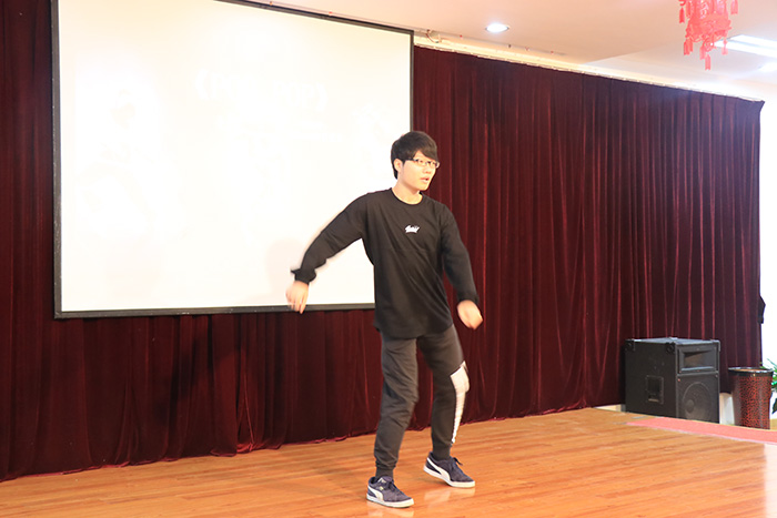 的张辰风及朱赟同学,宣布表演开始。第一部分:黄煜东同学的街舞表演《POP POP》,机械感十足的街舞让在场所有观众都眼前一亮。