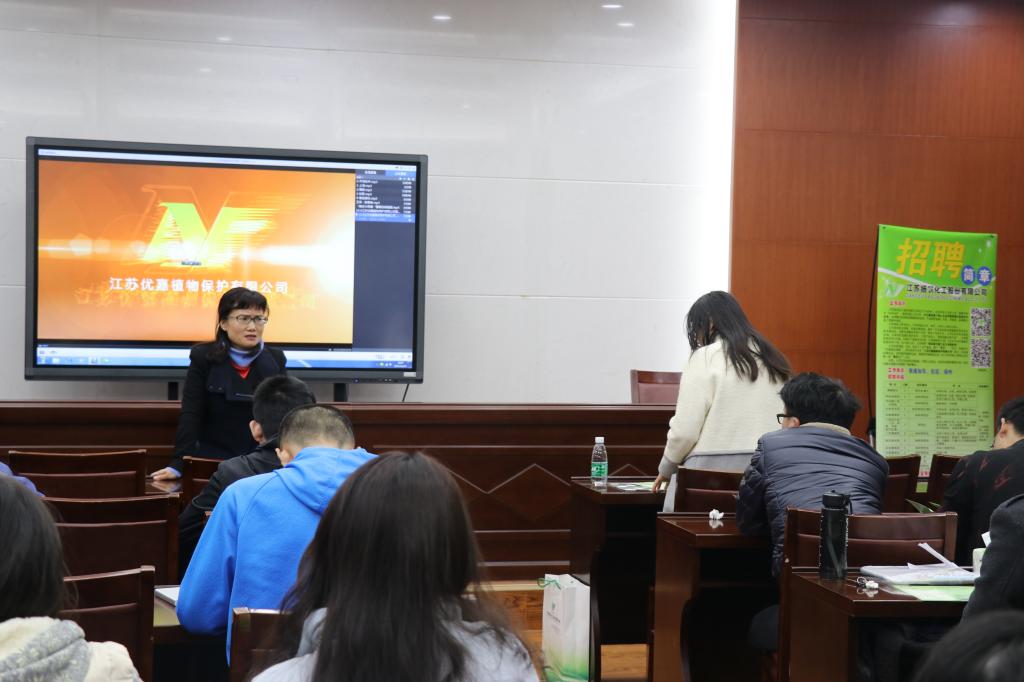 报告厅进行招聘宣讲,公司人事部主任张瑜蓉老师、学院党委副书记刘照云老师以及化学、植保等校内各对口专业感兴趣的学生参加了此次活动。