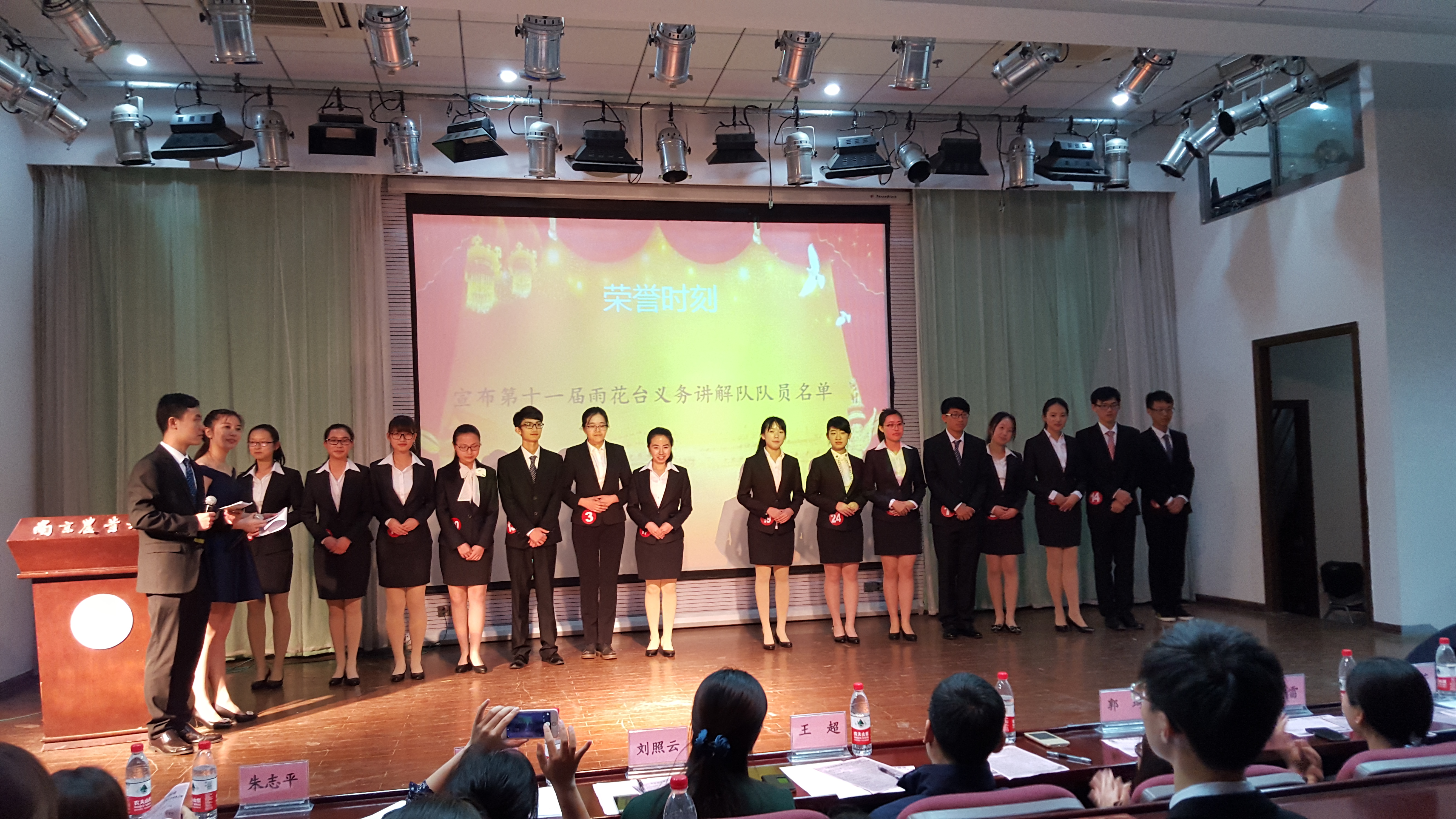 合唱团为大家带来一首《国家》。同学们身着粉红色院服,投入的演唱感染了在场的每一位观众,国的家住在我们心中!比赛到达高潮部分,根据每位选手的平均得分,最终评选出前16位优秀成员。最后雨花台讲解队队长孙传浩讲述了自己在讲解过程中的经历和收获,对后辈的期望仍萦绕在耳旁。