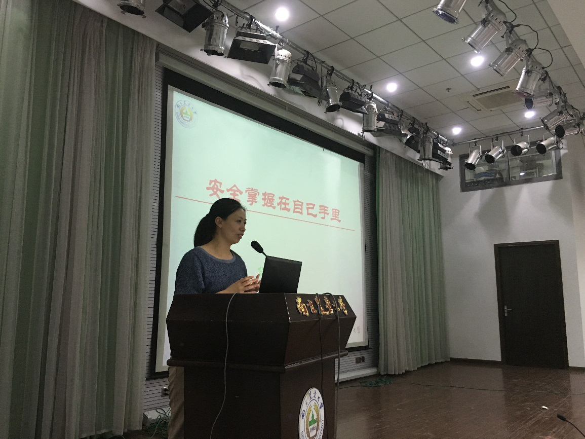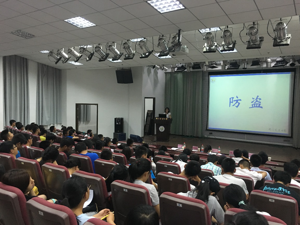 在教四楼报告厅开展2016级本科生新生主题入学教育,特邀校心理健康教育中心主任徐梅老师和保卫处治安科副科长刘晓婷老师分别进行了大学生心理调适讲座和安全知识培训,参与本次活动的还有学院党委副书记刘照云老师,辅导员黄芳老师和周玲玉老师。