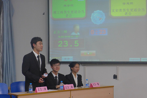 与信息院的辩论赛在教四楼B403展开,经过一个多小时的激烈角逐,我院战胜了信息院,成功晋级了八强。