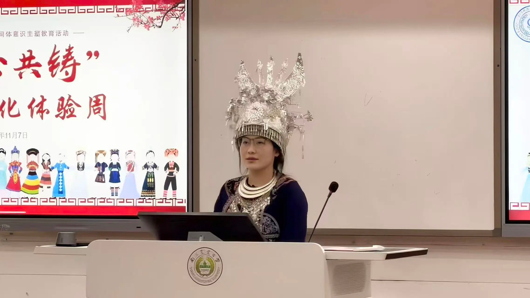 水族同学吴金芸通过图文并茂的讲解,展示了“水书文化”的独特魅力。这种古老而神秘的文字体系,是我国少数民族重要的文化遗产之一。吴金芸同学身着传统服饰,生动讲述了水族的历史和传统节日的习俗。在这样形象而又有趣的讲解中,同学们不仅了解了水族的历史渊源、生活方式,还感受到了水乡儿女的淳朴风情。